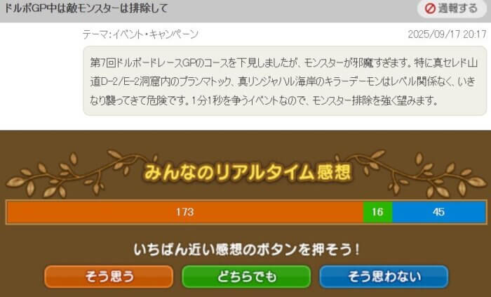 第7回ドルボードレースの敵が邪魔すぎる。危険なので排除してほしい」という提案です。