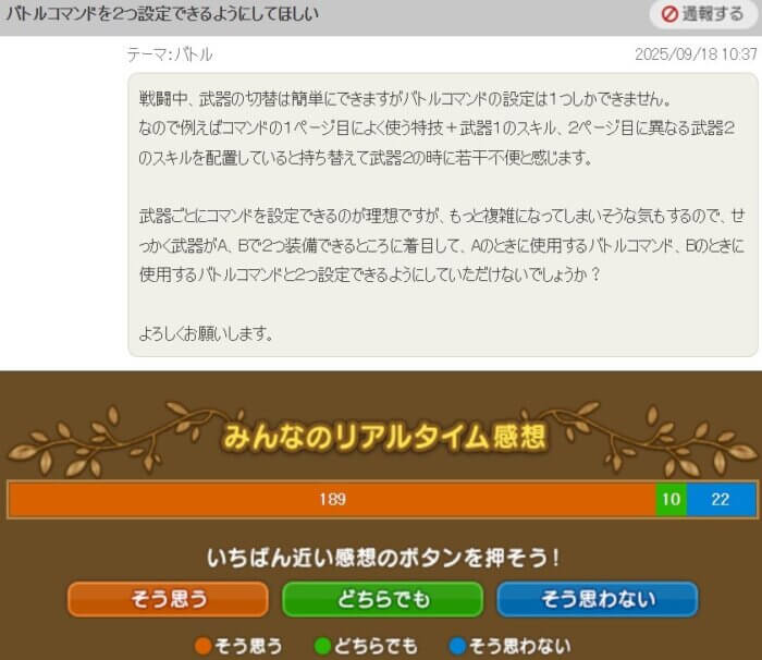 「武器を複数扱う場合バトルコマンドが不便なので、武器AとBのバトルコマンドを設定できるようにしてほしい。できれば武器ごとに設定できるの理想」という提案です。