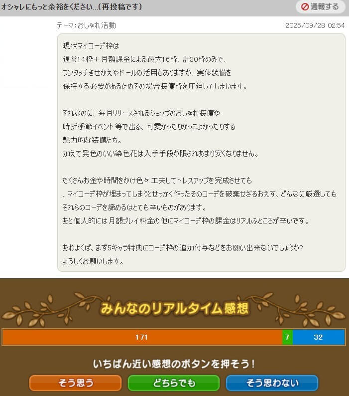「現在マイコーデ枠が最大30枠ですが、足りないので5キャラ特典にコーデ枠の追加付与などをしてほしい」という提案です。