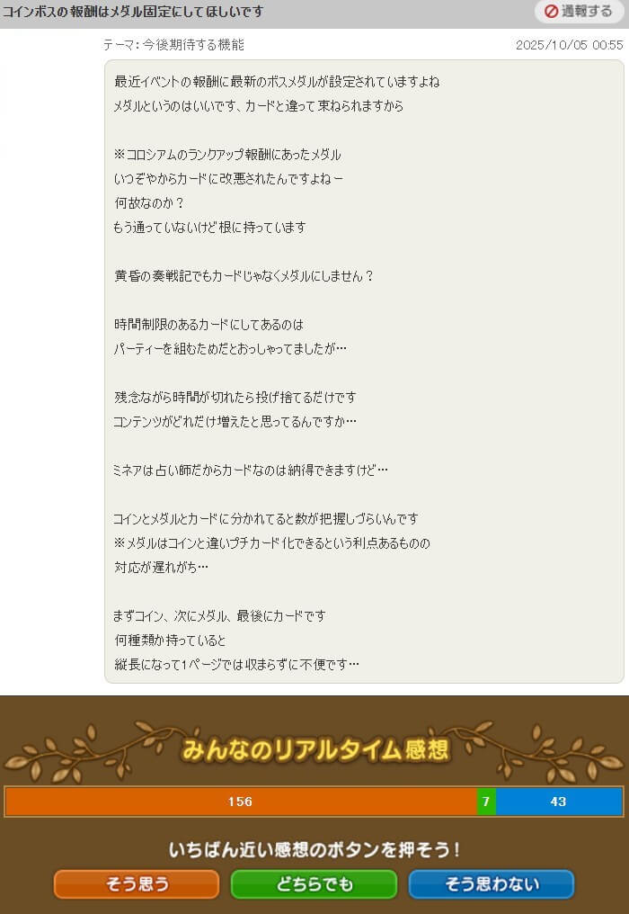 「コロシアムなどの報酬でコインボスはカードをやめて、メダル固定にしてほしい」という提案です。