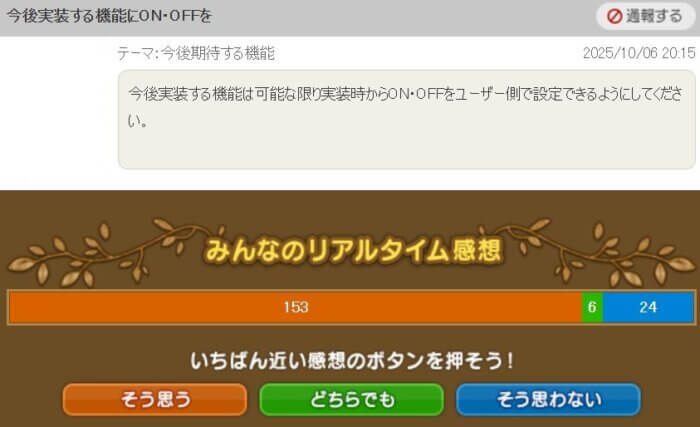 「今後実装する機能は可能な限り実装時からON・OFFをユーザー側で設定できるようにしてほしい」という提案です。
