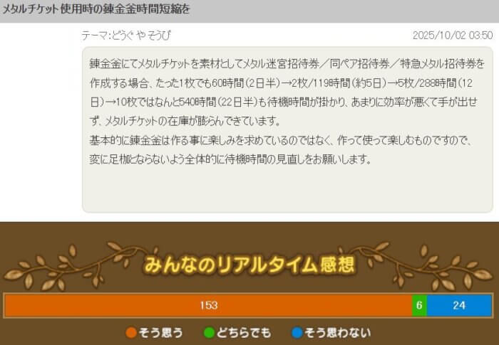 「錬金釜でメタルチケットでメタル迷宮招待券などを作成した場合60時間もかかる。10枚でも540時間かかるため、待機時間の見直しをしてほしい」という提案です。