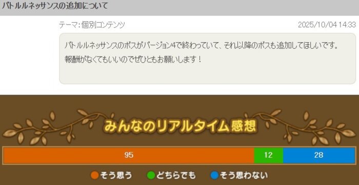 「バトル・ルネッサンスのボスがバージョン4で終わっていて、それ以降のボスも追加してほしい」という提案です。