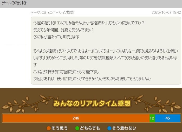 「「エルフしか勝たん」や「他種族のセリフ」はいつ使うのか?「こんばんは」や「よろしくお願いします」などあいさつ系のセリフにしてほしい」という提案です。