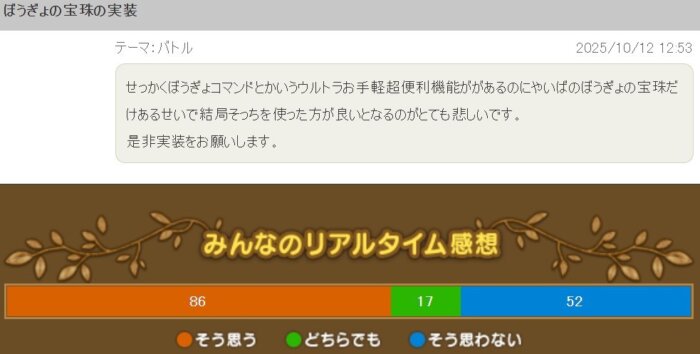 「せっかくぼうぎょコマンドというウルトラお手軽超便利機能があるのに、宝珠があるやいばのぼうぎょを使った方が良いとなっている。ぼうぎょの宝珠を実装してほしい」という提案です。