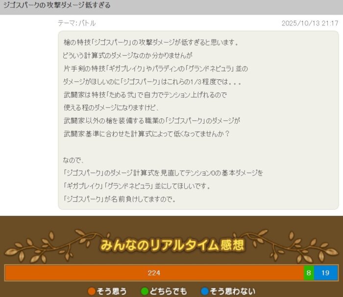 「ジゴスパークのダメージが低すぎる。ギガブレイクやグランドネビュラ並みに強化してほしい」という提案です。
