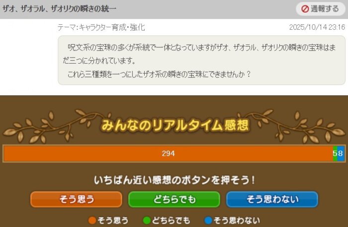 呪文系の宝珠の多くが系統で一体となってるので、ザオ・ザオラル・ザオリクの瞬きの宝珠もザオ系の瞬きの宝珠に統合してほしい」という提案です。