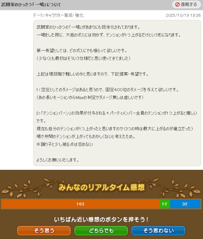 「武闘家の一喝がほとんどのボスに効かず弱体化されてるので、せめて固定ダメージやバフ効果などを付けてほしい。」という提案です。
