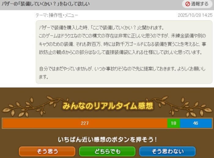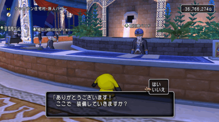 ここで装備していくかい?はドラクエの伝統的なセリフですが、確かにドラクエ10のバザーで高額な装備の買い物をする時は事故りそうでちょっと怖いですよね><