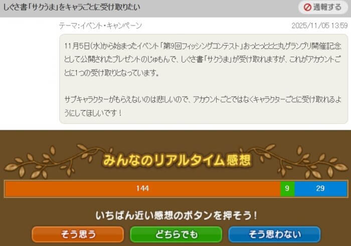「プレゼントのじゅもんでしぐさ書「サクうま」が受け取れますが、アカウントごとに1つなので、全キャラクター受け取れるようにしてほしい」という提案です。
