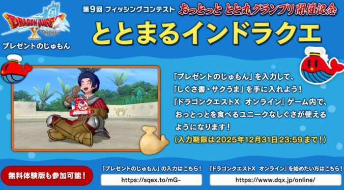 第9回フィッシングコンテスト「おっとっと とと丸グランプリ」のコラボで、「しぐさ書・サクうま」がもらえます!(プレゼントのじゅもん:ととまるインドラクエ)
