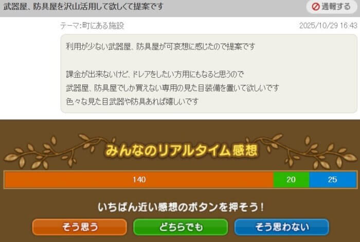 「利用が少ない武器屋・防具屋が可愛そうなので、専用の見た目装備を置いてほしい。色々な見た目武器・防具があれば嬉しい」という提案です。