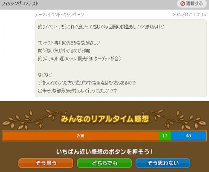 「釣りイベントが全然改善されませんが、専用のおさかな袋が欲しい、関係ない魚が邪魔などの問題を対応してほしい」という提案です。
