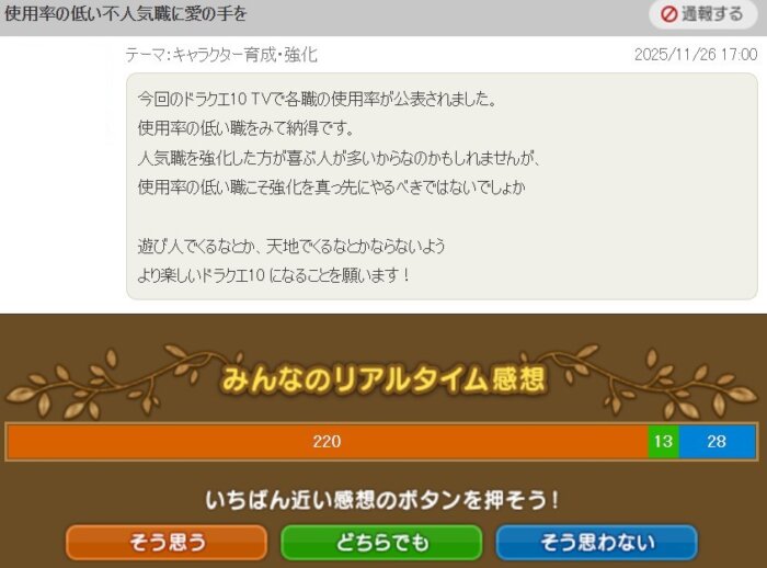 「ドラクエ10TVで各職の使用率が公開されましたが使用率の低い職を見て納得。使用率の低い職こそ真っ先に強化してほしい」という提案です。
