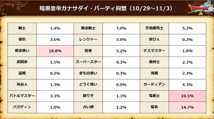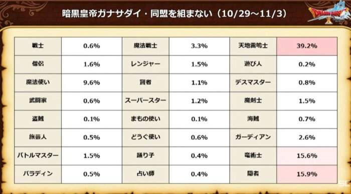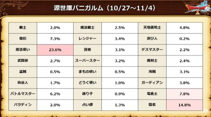 使用率低い職業は大体同じで、遊び人・スーパースター・遊び人・盗賊・まもの使い・どうぐ使い・踊り子辺りが低かったですね><
