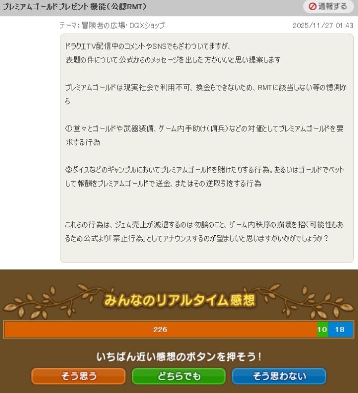 DQXショップギフトのプレミアムゴールドのRMTに関してのアナウンスを公式から出した方が良い」という提案です。