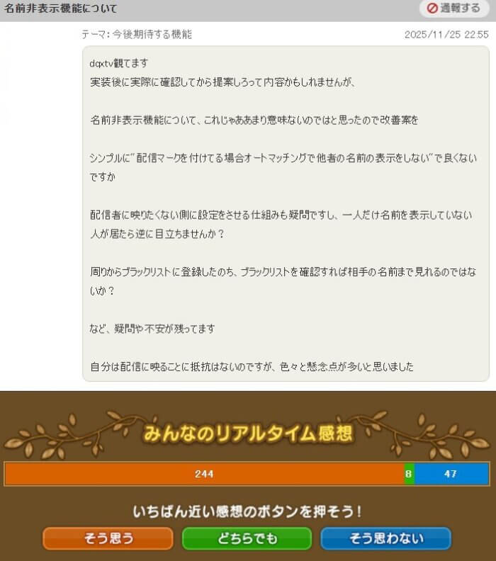 以上、配信マークを付けてる時に名前非表示になるようにしてほしい!?でした!