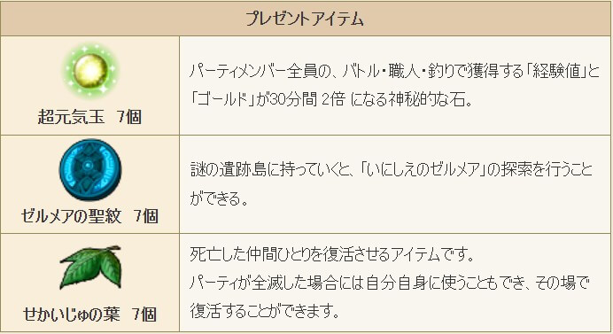 明日のメンテ後から、冒険者の広場で上記アイテムがもらえます!