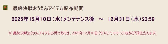 受け取り期間は2025年12月10日(水)メンテナンス後~12月31日(水)23:59までと長めなので、忙しいアプデと重なっても安心です!