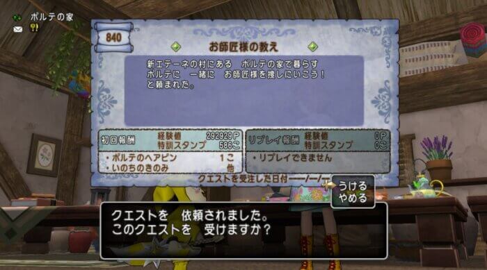 新エテーネの村のポルテの家のポルテから「お師匠様の教え」のクエストを受注