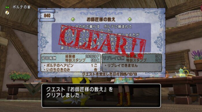 新エテーネの村のポルテの家に戻り、ポルテに報告してクエストクリア!