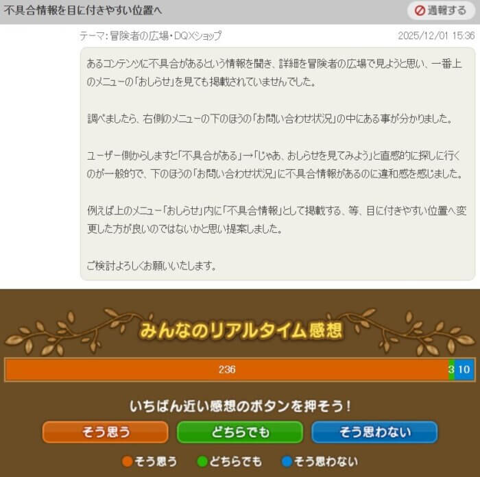 不具合情報を確認しようとしてお知らせを見ても掲載されていなかった。右のメニューの下の方のお問い合わせ状況から不具合確認できるみたいで、分かりづらいので場所を変更してほしい」という提案です。