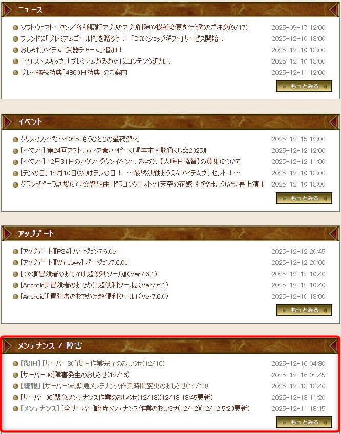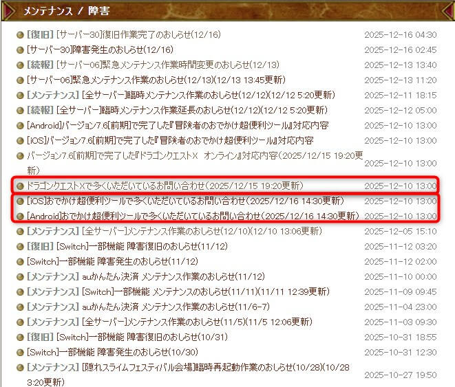 冒険者の広場の右側のメニューのかなり下の方にある「お問い合わせ状況」から不具合の確認をできます。