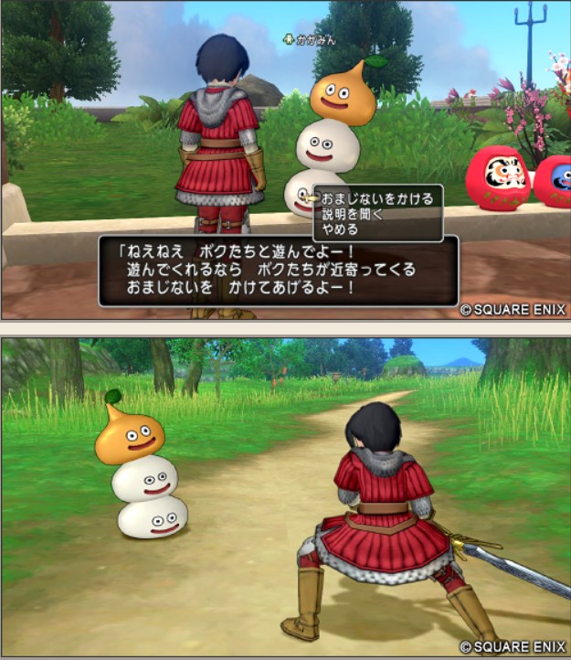 「かがみん」におまじないをかけてもらい、「スライムかがみもち」「メタルかがみもち」をたくさん倒す