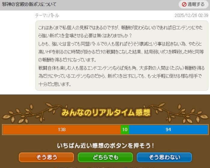 「報酬が変わらないのであれば、旧コンテンツの邪神の天獄に強い新ボスを登場させる必要はなくはありませんか?」という提案です。