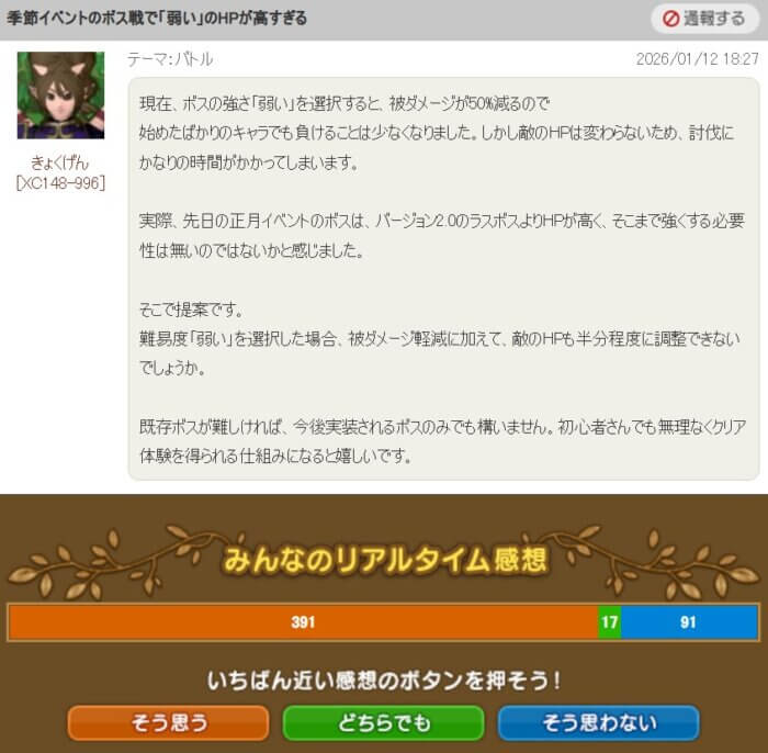 季節イベントでボスの強さ「弱い」を選んでもHPは変化しないため討伐に時間がかかってしまう。HPも半分程度にしてほしい」という提案です。