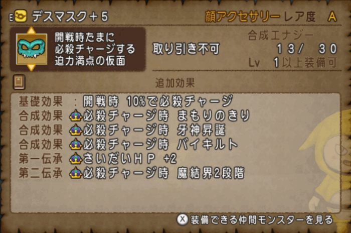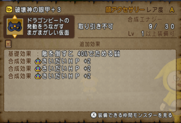 まず破壊神の眼甲の基礎効果「敵を倒すと40%でためる」の使い道が少なく、合成効果はまさかの機神の眼甲と全く同じ