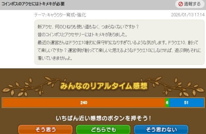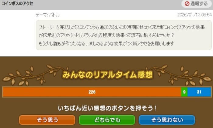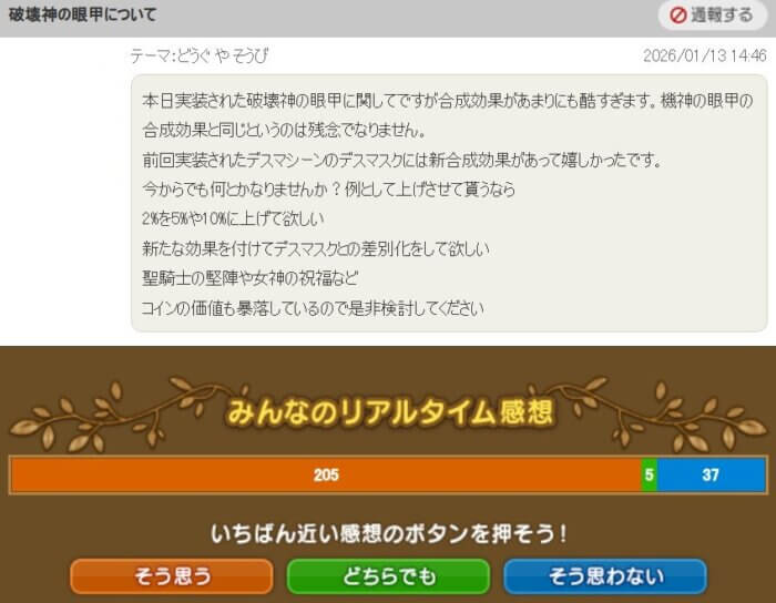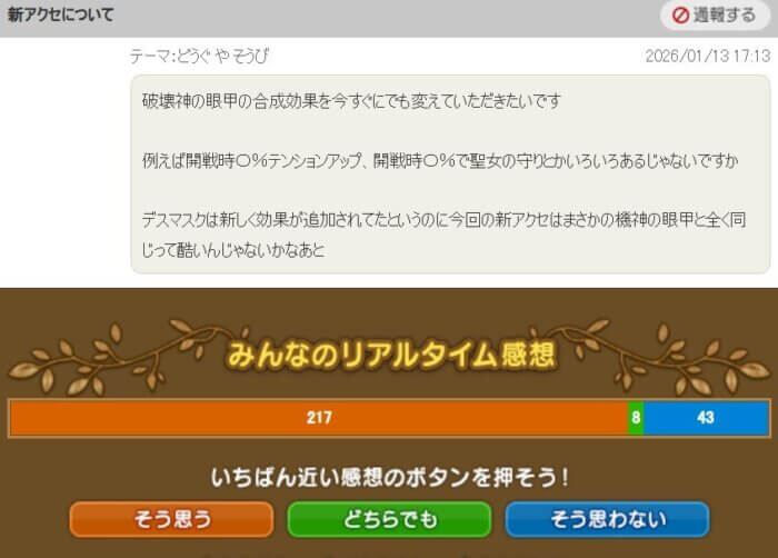 新アクセ「破壊神の眼甲」の効果が伝承前に少しプラスされる程度の効果はさすがに酷すぎる。誰もが作りたくなる楽しめる効果が付く新アクセをお願いします」という提案です。