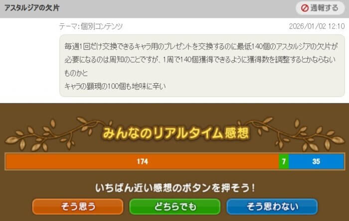 「アスタルジアの欠片を1周で140個獲得できるように調整してほしい」という提案です。