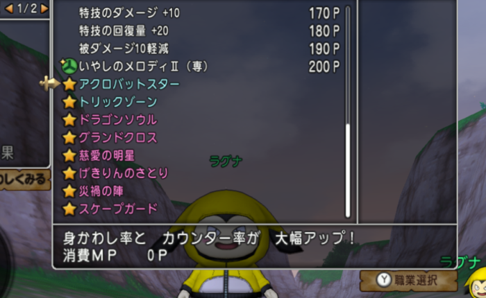 サポート仲間で人気な旅芸人は、必殺技アクロバットスター(自分にカウンター・身かわし率アップ・テンション1段階アップ+自分以外の味方に身かわし率アップの効果)を使うのですが、あまり強くないし短い戦闘では完全に不要なので、ひっさつのオフ機能があればかなり便利になりそうです!