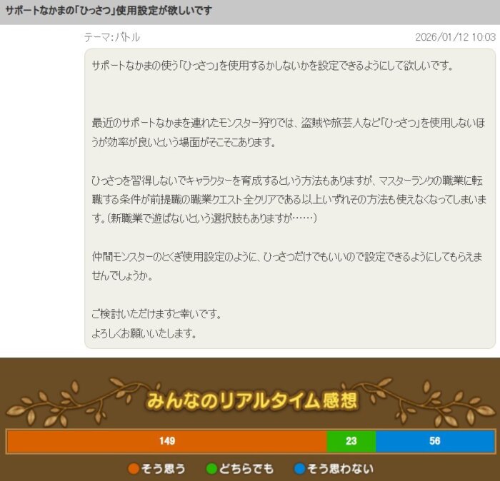 「サポートなかまの「ひっさつ」を使用するかしないかを設定できるようにしてほしい」という提案です。