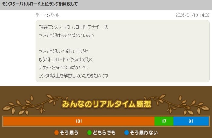 モンスターバトルロード・アナザーのランク上限解放が求められている!?