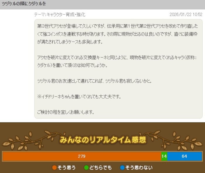 コインボスの悪セで装備枠が満たされるケースが多発するので、ツヅケル君の隣にクダケル(現物を破片に変えてくれるキャラ)を置いてほしい。」という提案です。