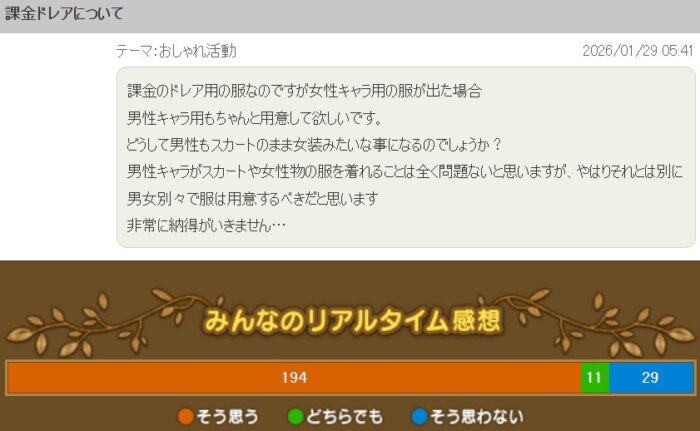 どうして男性もスカートのまま女装みたいなことになるのか?課金ドレアで女性キャラ用の服が出た場合男性キャラ用も用意してほしい」という提案です。