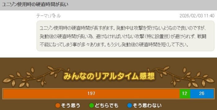 「ユニゾン使用時の硬直時間が長すぎる。短くしてほしい」という提案です。