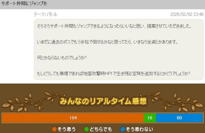 過去のボスで余裕で倒せると思ったらいきなり全滅とかあるので、サポート仲間もジャンプできるようにしてほしい」という提案です。