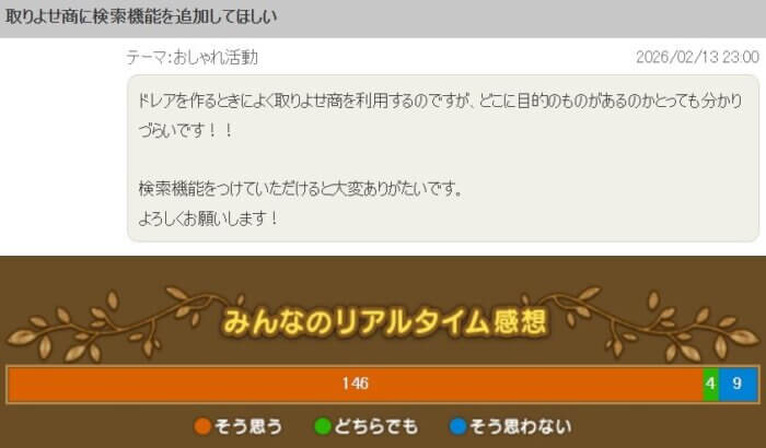 これからも取り寄せ商にどんどん装備が追加されると思うので、検索機能実装してほしいですね!