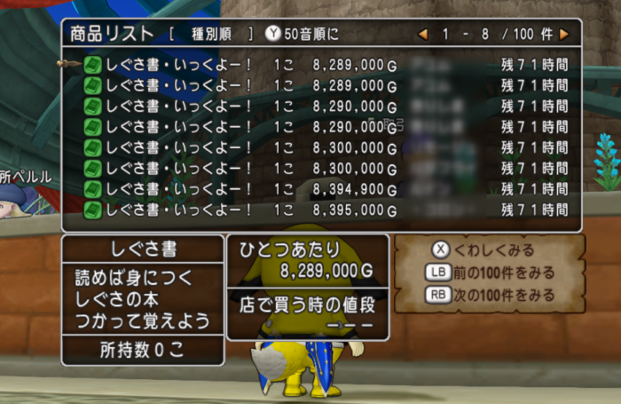 しぐさ書・いっくよー!の初日のバザー価格はなんと約830万Gとかなり高額です><