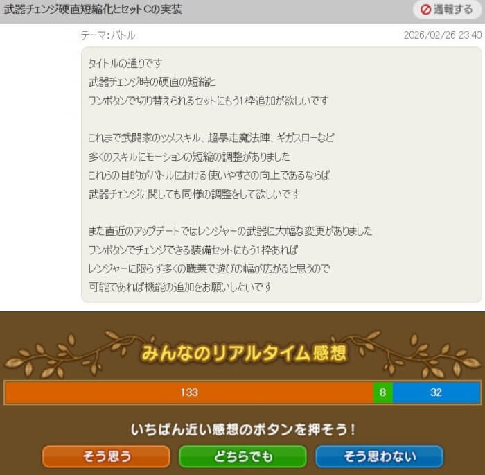「武器チェンジ時の硬直短縮とワンボタンで切り替えられるセットCを実装してほしい」という提案です。