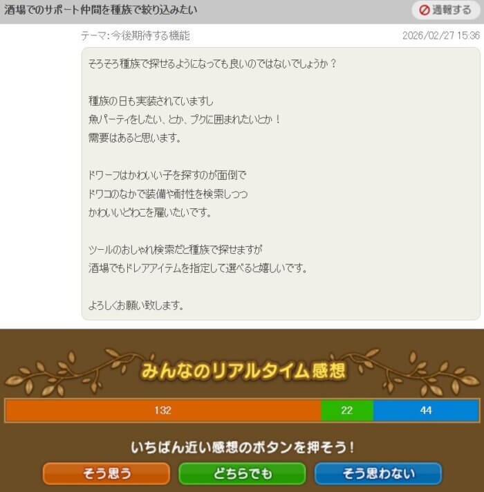 種族の日も実装されたし需要があると思うので、そろそろ酒場で種族で探せるようにしてほしい」という提案です。
