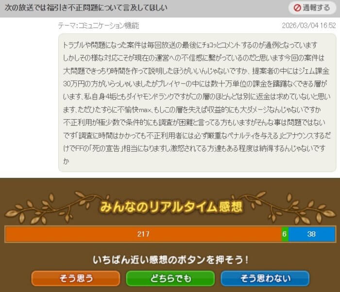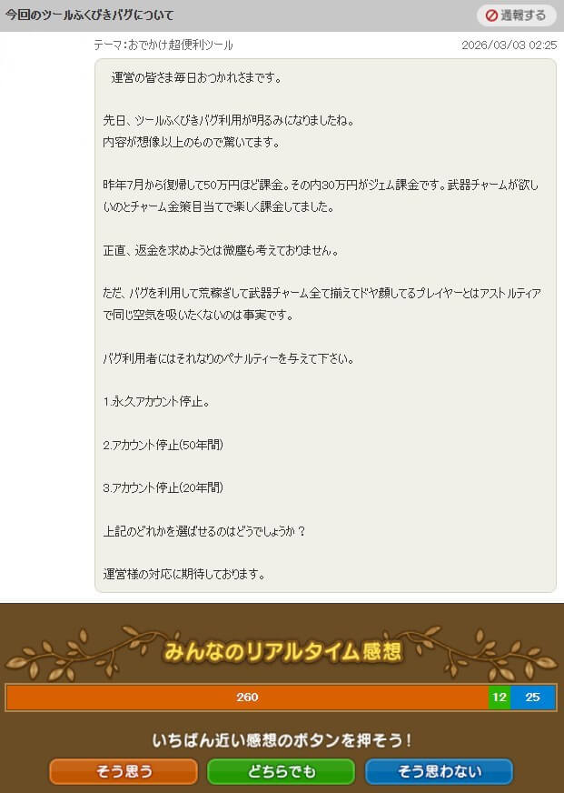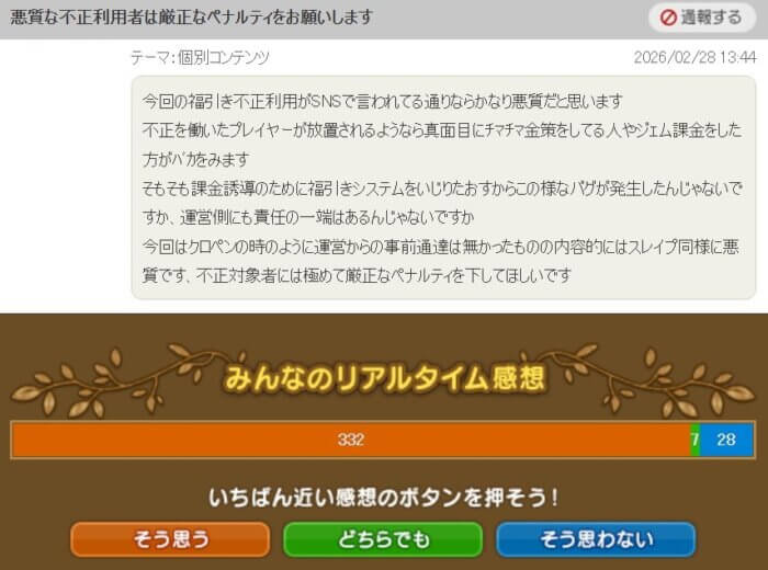 「今回の福引不正利用はかなり悪質だと思う。真面目に課金してる人がバカを見るので不正対象者には極めて厳正なペナルティを下してほしい」という提案です。