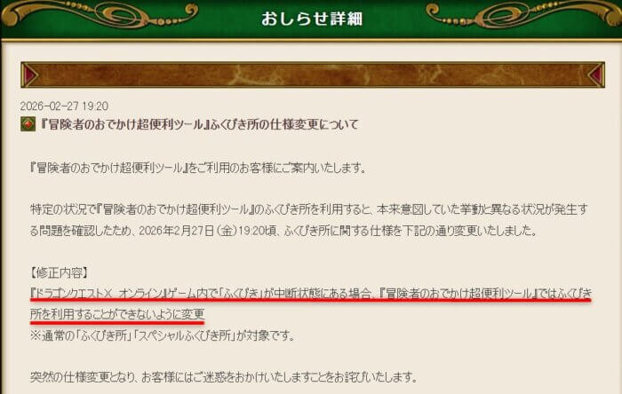 2026/2/27に『冒険者のおでかけ超便利ツール』ふくびき所の仕様変更についてのお知らせがありました。
