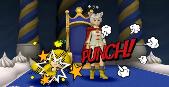 ホワイトショコラ城の場内のラキに話しかけると「しぐさ・ヒーローパンチ」をもらえます!(※受け取り期間は3月21日(土)23:59まで