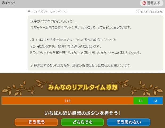 「今年も春イベントが無いということでとても寂しい。季節イベントやその時に出る家具・庭具が楽しみなので開催してほしい」という提案です。