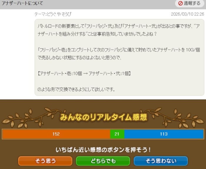 「アナザーハートを組み分ける事前告知が無かったので、アナザーハート・壱をアナザーハート・弐に交換できるようにしてほしい」という提案です。