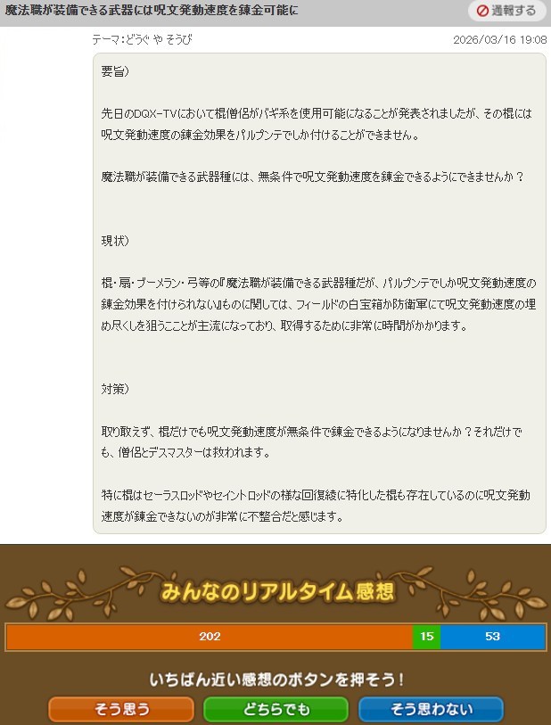棍僧侶がバギ系を使用可能になったが棍に呪文発動速度をパルプンテでしかつけることができない。魔法職が装備できる武器は無条件で付けられるようにしてほしい」という提案です。